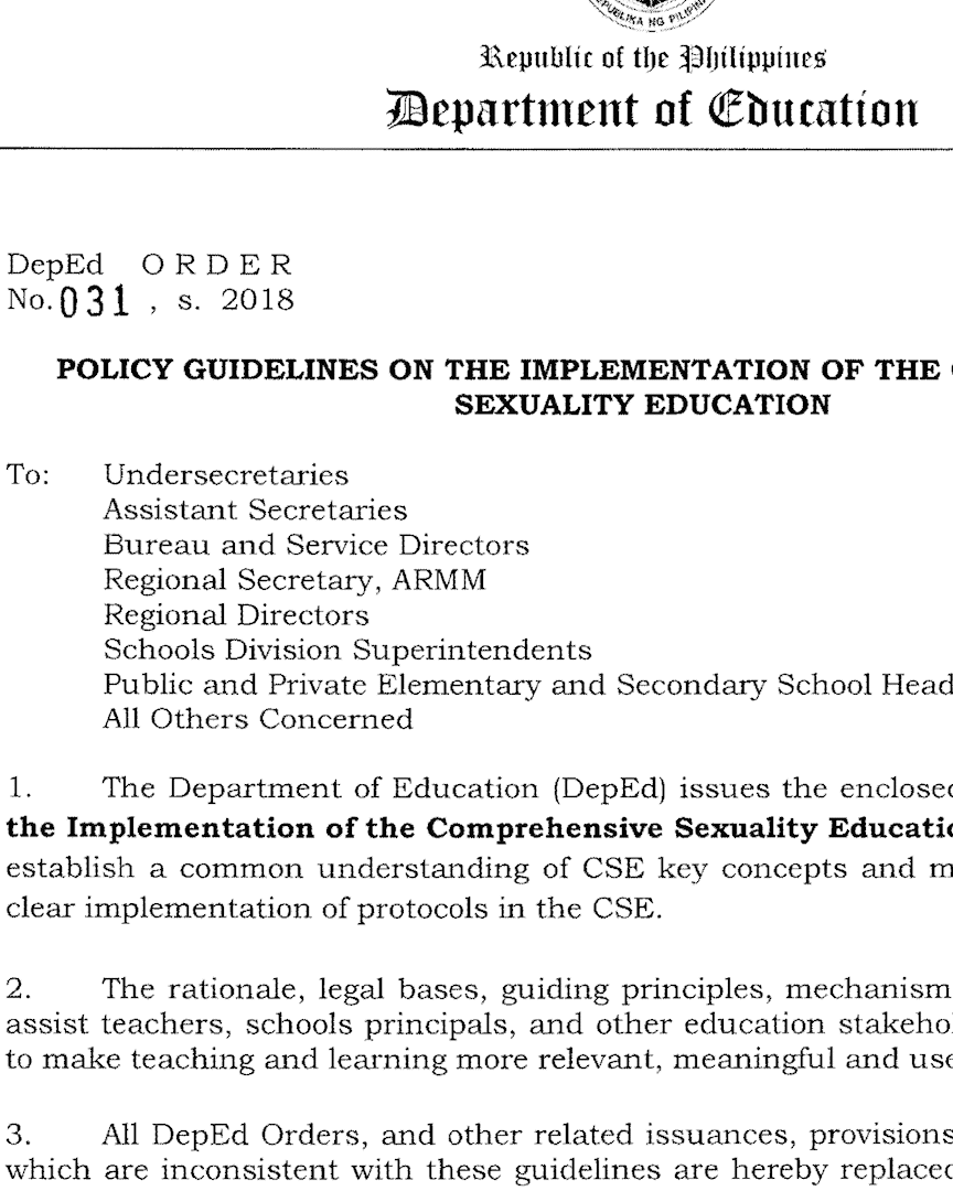 This memo by the Department of Education has implemented the rolling out of sexual education based on the UNESCO/WHO Document "International technical guidance on sexuality education" which contains guidelines that diminish the sanctity of the Filipino family and the role of parents in sex education, as well as exposing our children to inappropriate and premature content. This is both unconstitutional and incongruent with our own culture and values as a nation.